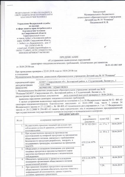 ОТЧЕТ об исполнении предписания об устранении нарушений МБДОУ детский сад №10 Ромашка (1)